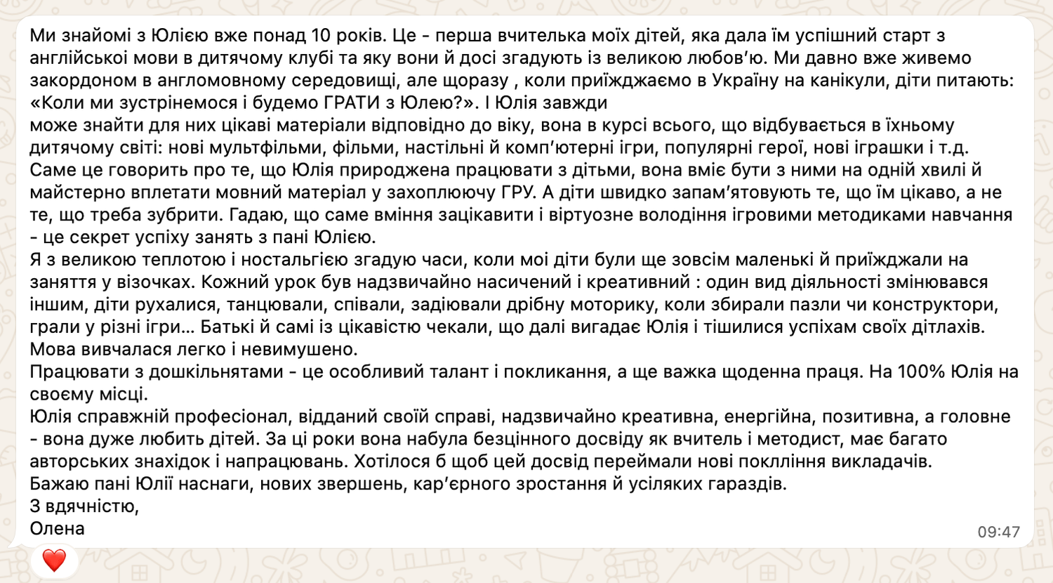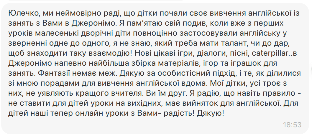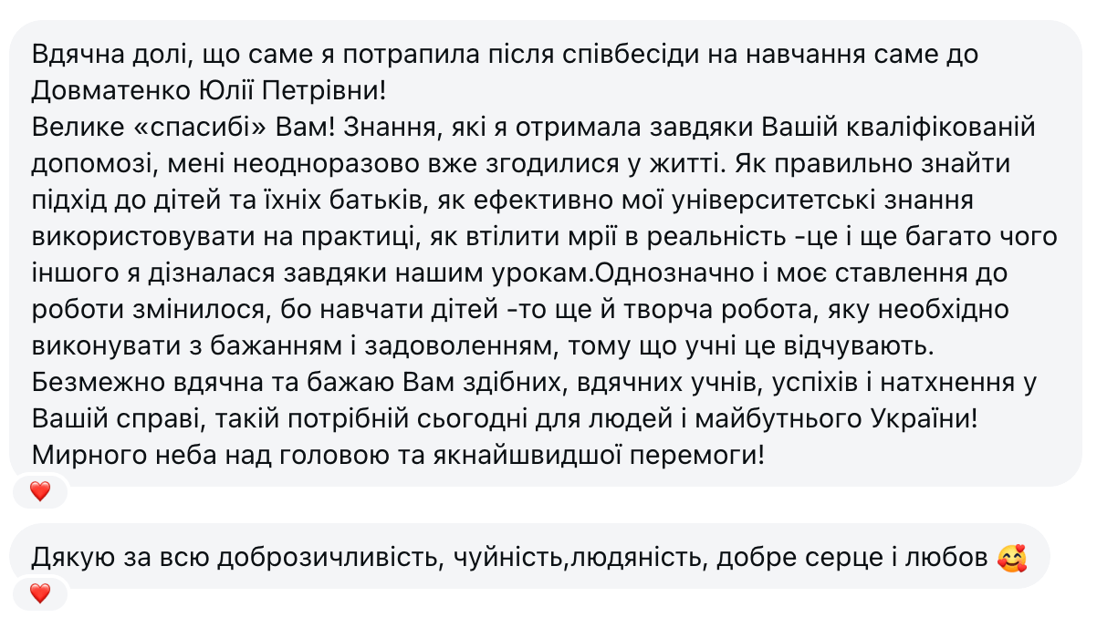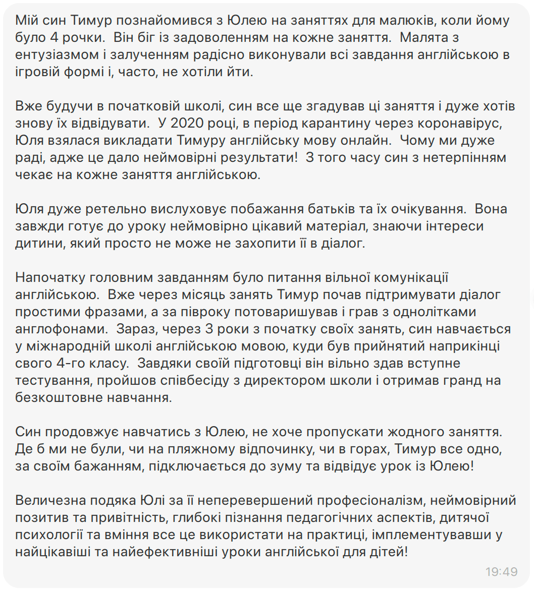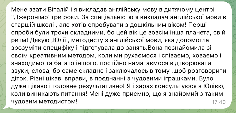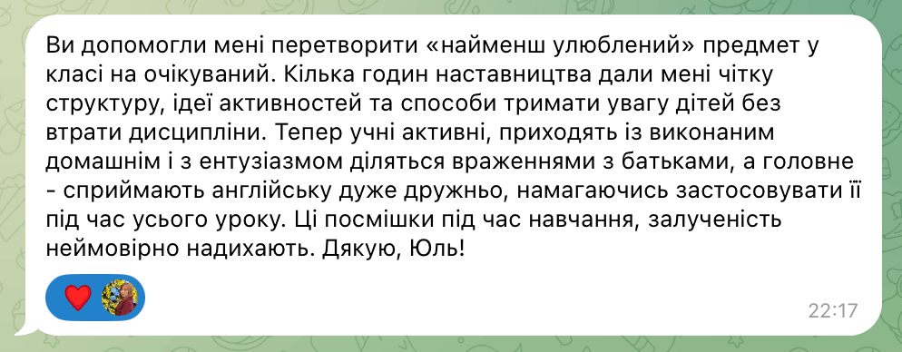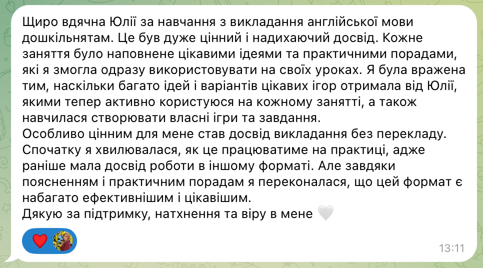 "Учні люблять мої заняття за веселу атмосферу та веселі завдання. Батьки задоволені, бо діти розмовляють англійською. І тепер я з радістю ділюся своїми знаннями, фішками, які щодня використовую у навчанні дітей, щоб ваші заняття стали ще цікавішими, легшими й ефективнішими".
